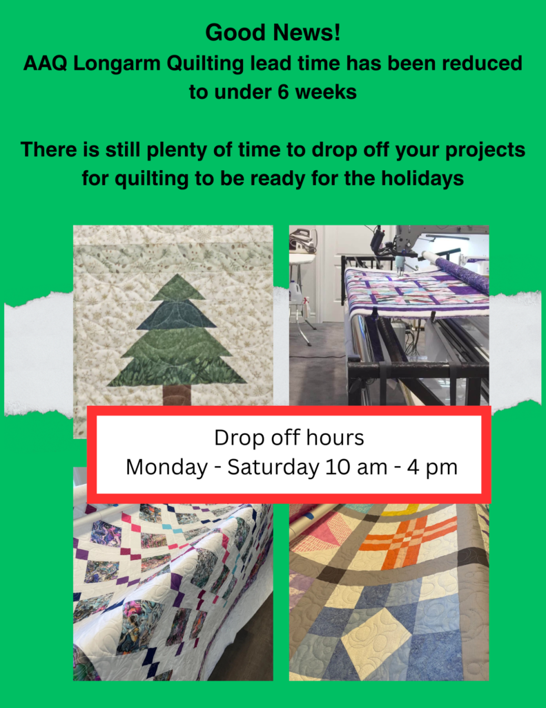 Our shop features over 1300 bolts of high quality fabrics and new shipments arrive every few days. We are proud that our many samples inspire quilters to start a new project whether it is a large quilt, a table runner or placemats to give as a gift, a designer bag or a unique pillowcase. Our longarm quilting business enjoys a respected reputation in the area.